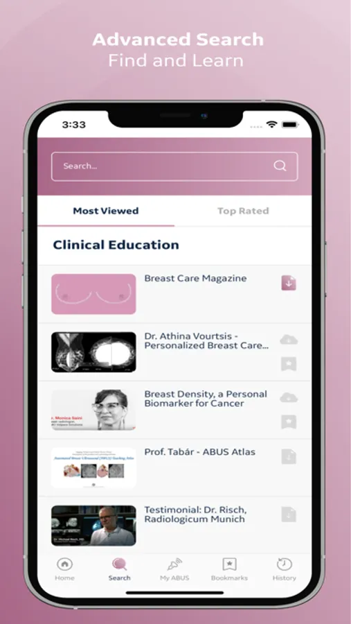 It provides a comprehensive range of clinical education tools, such as webinars, case studies and white papers as well as teaching quick cards and videos. There is our GE Breast Magazine and the ABUS Mastery Education Portal and users can explore technology aids.
