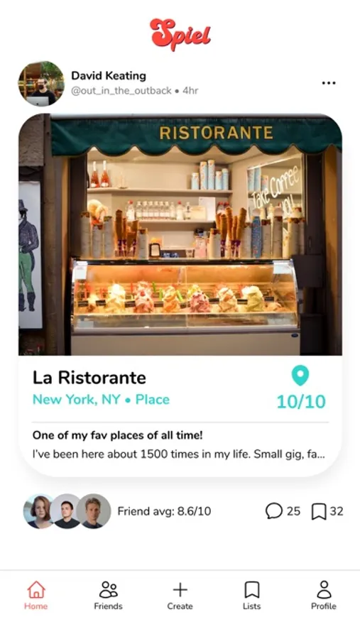 Spiel is the first interactive review app for friends to rate and review anything—from NY's best slice of pizza to nostalgic tv shows to an awkward interaction so terrible it sent you to therapy.