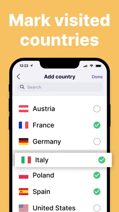 Keep track of all the amazing places you've been and share your adventures with friends using Been There! This custom map of the world allows you to mark all the countries and places you've visited.