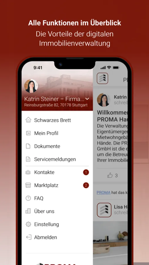 Als Kunde der PROMA Hausverwaltung GmbH profitieren Sie von einem besonders innovativen Kundenservice, der Ihnen viele Freiheiten bietet. Mit der PROMA App können Sie uns rund um die Uhr Anliegen und Schäden inklusive Fotodokumentation per Smartphone melden. Zusätzlich stellen wir Ihnen eine digitale Dokumentenmappe mit wichtigen Dokumenten für Ihre Immobilie(n) zur Verfügung. Über das digitale schwarze Brett informieren wir via Push-Nachricht proaktiv über wichtige Informationen rund um die uns anvertrauten Immobilien.