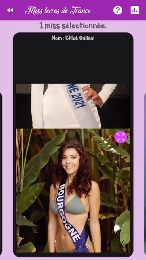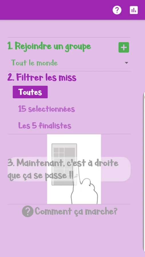- Retrouvez les statistiques (miss préférées du groupe, la personne du groupe ayant trouvé le plus de miss sélectionnées...) dans le menu dédié