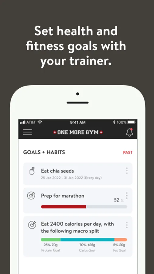 With the ONE MORE GYM App, you can start tracking your workouts and meals, measuring results, and achieving your fitness goals, all with the help of your personal trainer.