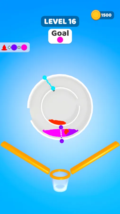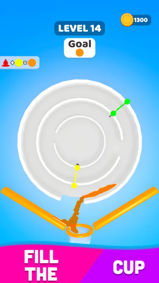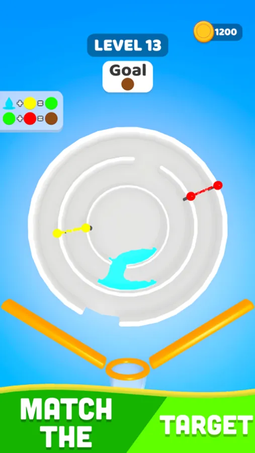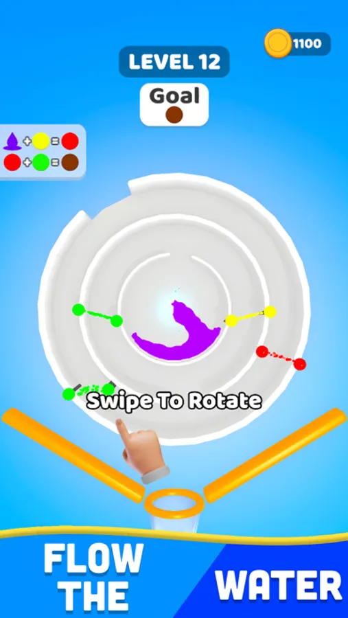 Rotate the maze, flow your fluid through the gates to change the color and reach the target color!