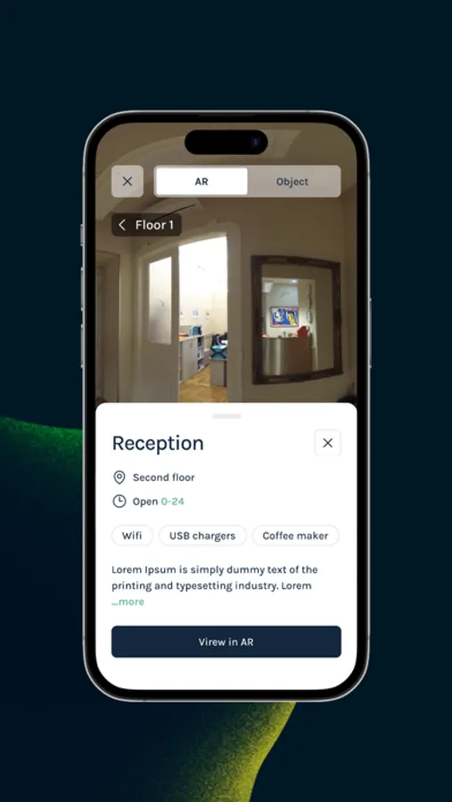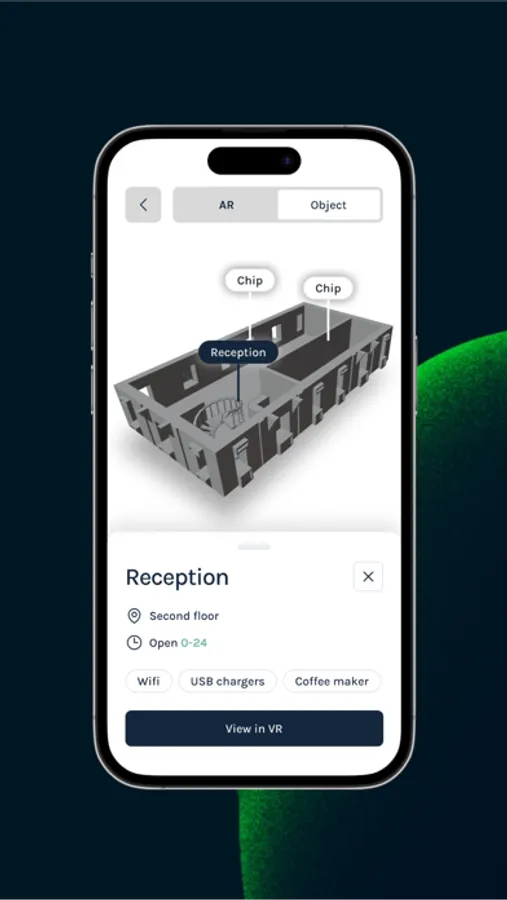 The OfficeR is a virtual tour of Appic Office with interactive trigger points and showcasing amenities. In the AR, the building can open up to observe each floor with its POI-s. In the VR, the office can be seen in 360º portals, like you were in the office.