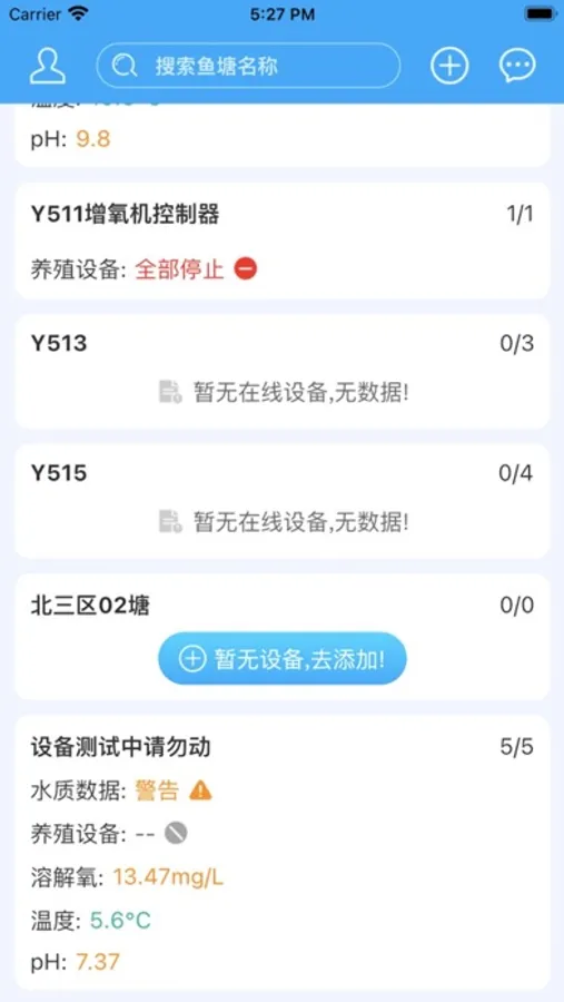2.首页下面是展示的各个池塘以及当前池塘设备在线状态和水质数据状态;