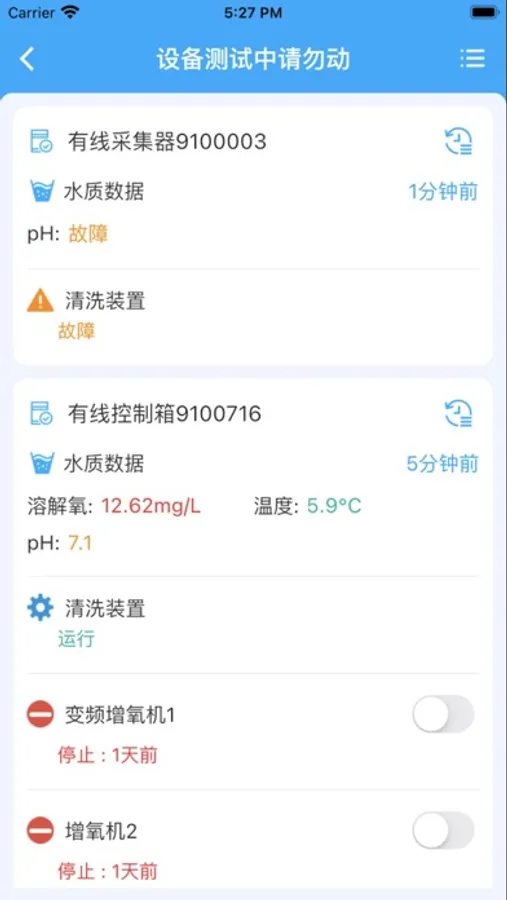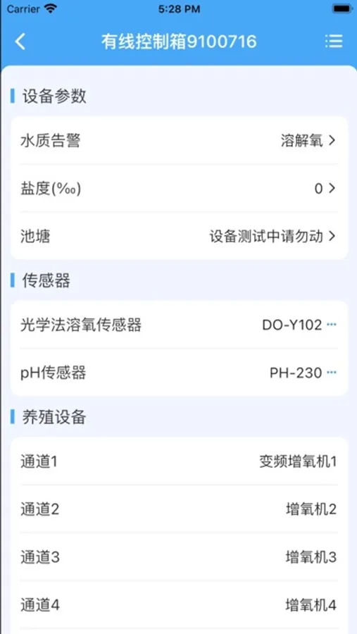 3.池塘详情界面显示池塘里面包含的养殖设备,以及设备在在线情况,和运作状态, 用户可以直接操作设备开关;