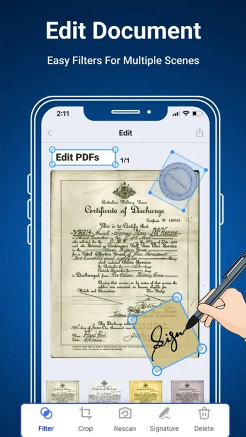The scanned images are converted into PDF format, and the app typically provides options to combine multiple scans into a single PDF file. You can also rearrange, rotate, or delete pages within the PDF, as well as add annotations, signatures, Text, Filters or watermarks.