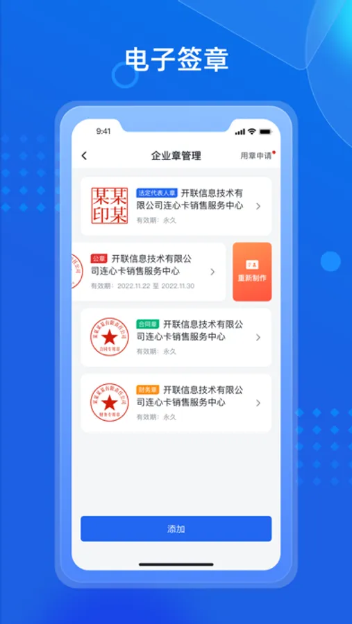 【在线印章】印章在线制作,支持企业公章、财务章、合同章、法人章等各类印章和个人签名的在线设置,使用记录全程追溯。