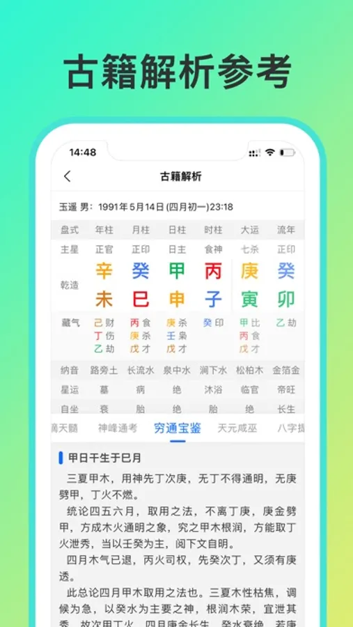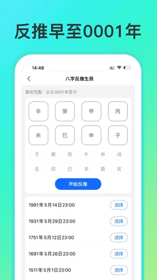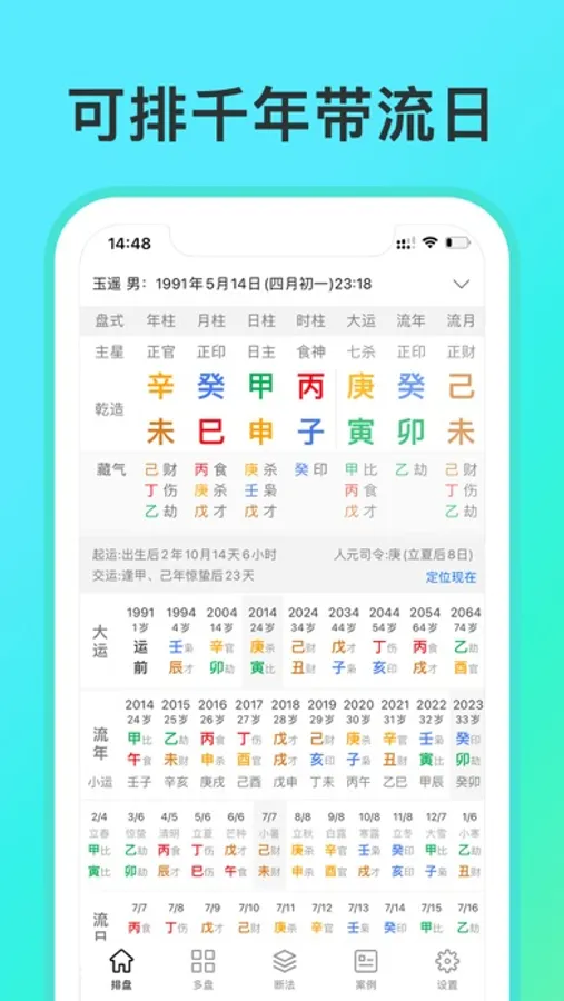 2、支持上千年八字反推、流日、真太阳时、早晚子时、各种人元司令定法、古籍解析。