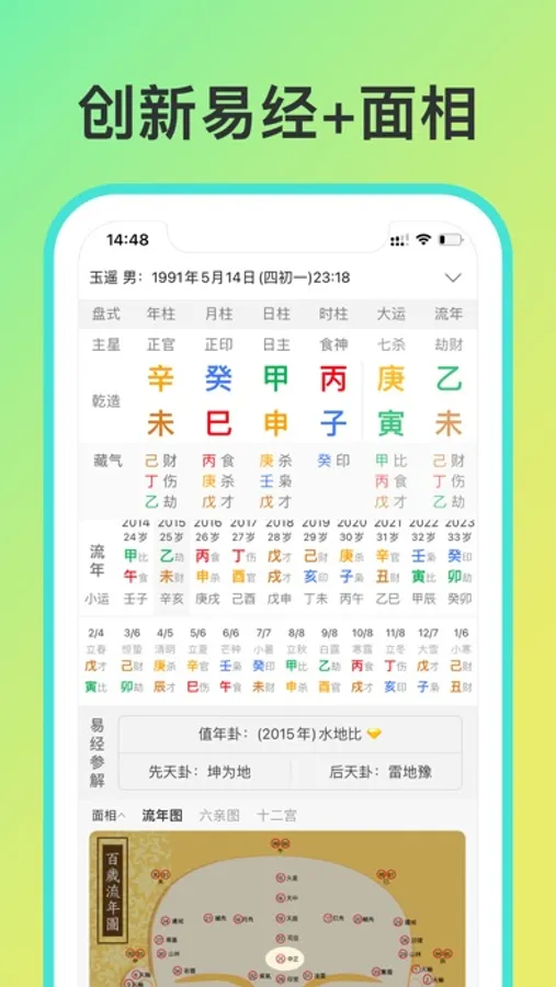 6、特别研发融入面相流年图参考的八字排盘工具。
