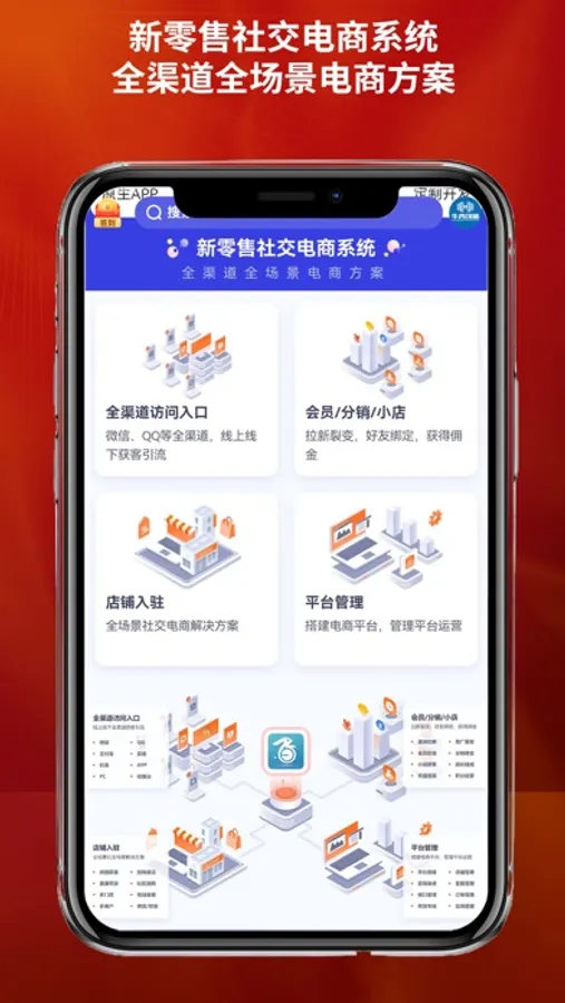 网页+小程序+APP+PC独立品牌商城,多种裂变及营销工具扩大经营;新零售线上线下一体化解决方案;支持多店连锁商家拓展线上销售渠道;