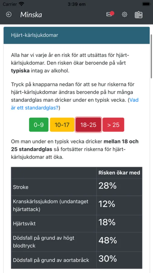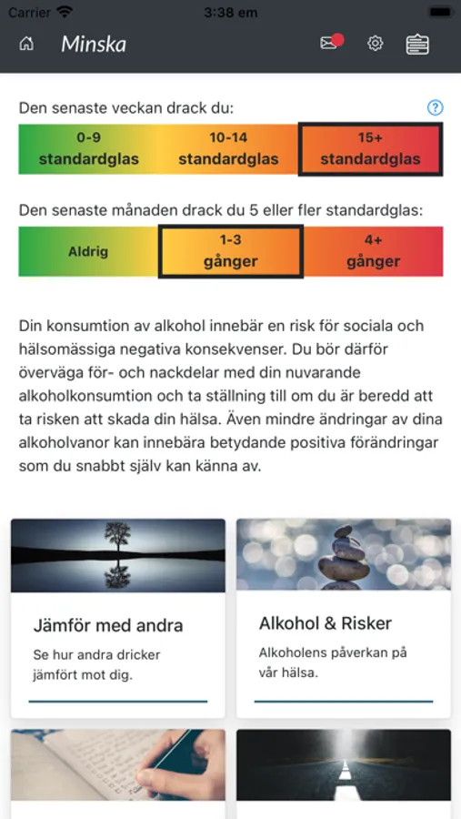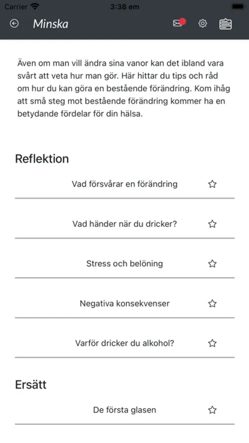 Stödet hjälper dig att reflektera över din konsumtion och ger dig tips och råd till förändring. Varje vecka ges du möjlighet att stämma av hur ditt drickande sett ut senaste tiden, och därefter ges du återkoppling och råd till förändring. Du kan gå in i appen när du vill för att läsa mer om hur man kan minska sin konsumtion och sätta mål. Under veckans gång får du också meddelanden med tips och råd till förändring.