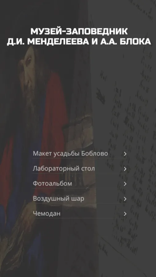 С приложением Mendeleev AR некоторые предметы экспозиции усадьбы Боблово, которая принадлежала Д.И. Менделееву, оживают и рассказывают свою историю.