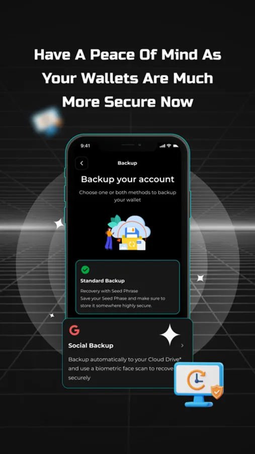 With two private key backup options: Advanced (Social Backup with iCloud or Google Drive) and Standard (private key or seed phrase), you can flexibly choose any backup method suited to your desire.
