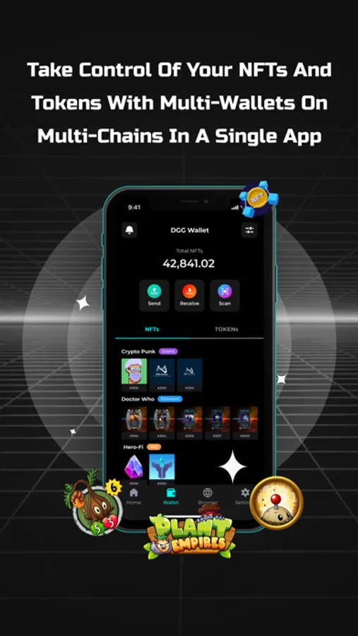 You can store and manage your valuable NFTs and Token by importing or creating and managing any number of wallets on different blockchains you desire in a single app - the DGG Wallet.