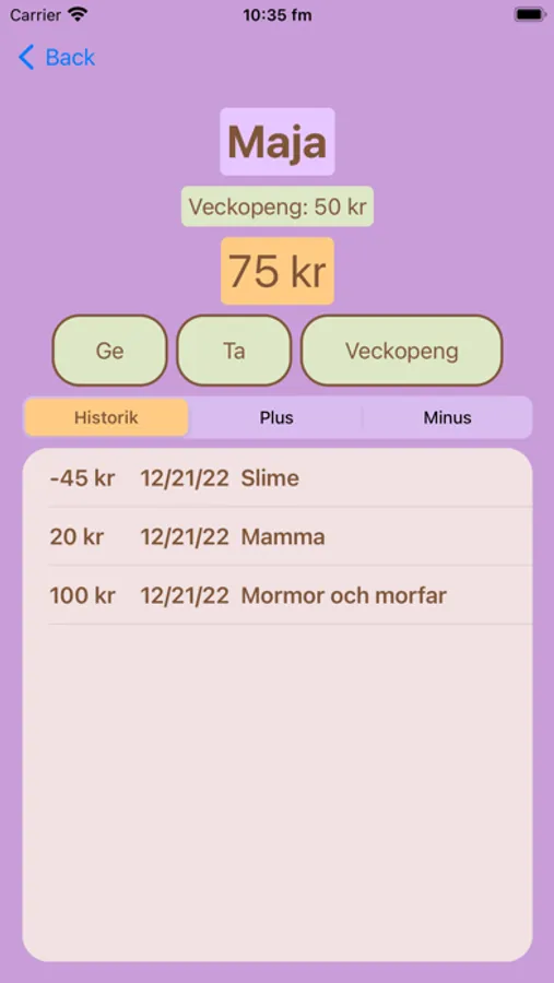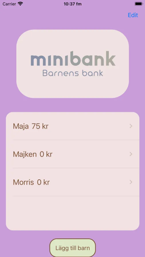 De mindre barnen har ju sällan bankonto och i dagens samhälle hanterar vi väldigt lite kontanter. Med den här appen kan du sköta barnens pengar helt virtuellt. Får dom 20 kronor av mormor? Lägg till 20 kr i barnets profil. Vill barnet använda dom? Dra bort pengar. Lägg även till meddelande som tex vem som gett pengar eller vad de använts till. Det går även att lägga till så att veckopengen sätts in automatiskt.