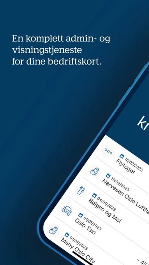 Bedriftskortappen er en administrasjons- og visningstjeneste for betalingskort (kreditt- og debetkort) for bedrifter. Appen gir kortholder tilgang til bedriftskortets saldo og transaksjoner. Saldo og transaksjoner vises på kortnivå. Saldo er tilgjengelig for debetkort. Signert kortholderavtale er en forutsetning for tilgang til tjenesten.