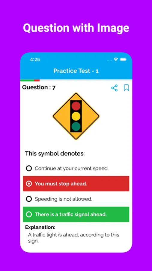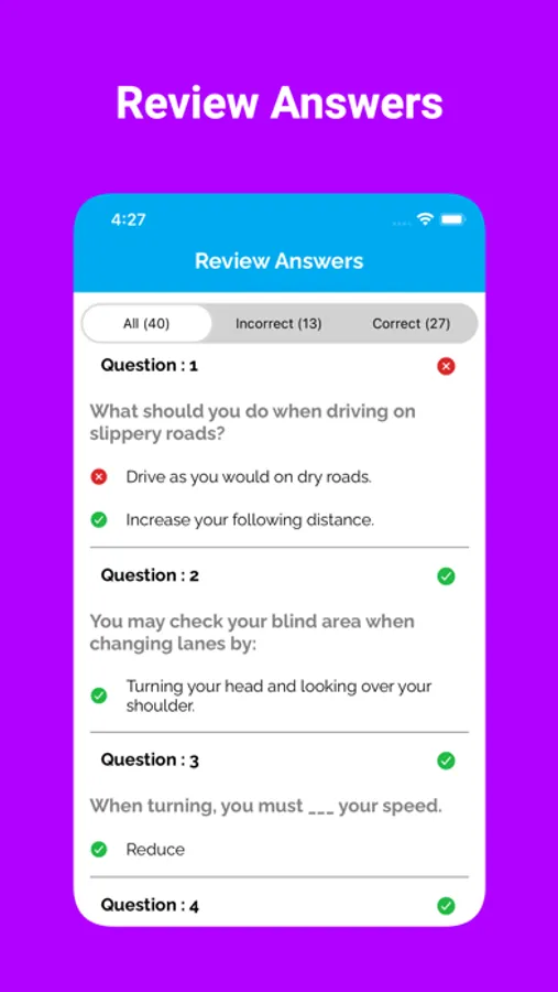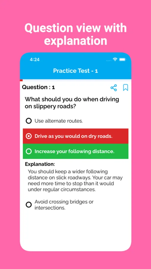 Our app includes a variety of practice questions for the Driver's license exam for Car, Motorcycle and Commercial Vehicles. These questions are based on the official handbook of different states.