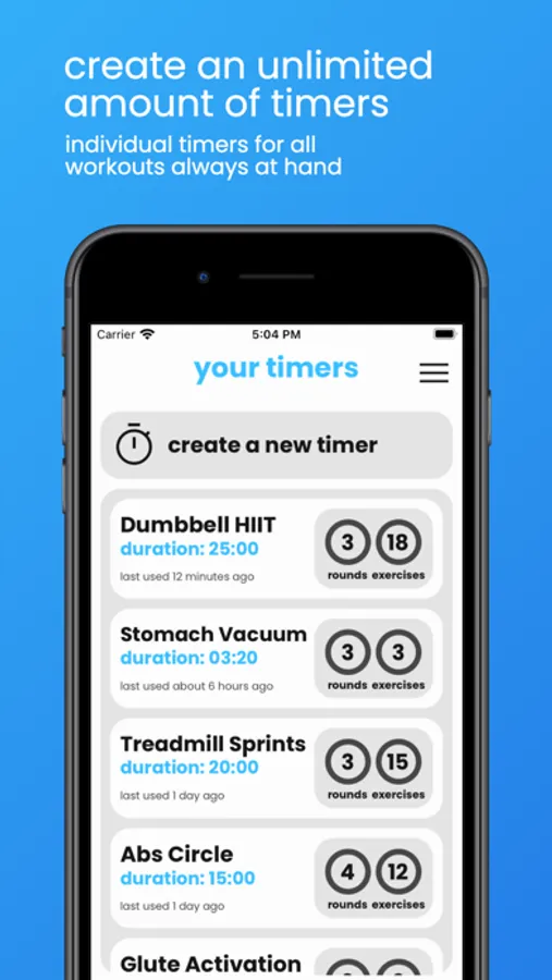 In addition, you can create any number of timers and store each of them to reuse whenever you want. This way, you won't have to keep resetting a single timer when you do several different interval workouts, each with its own requirements.