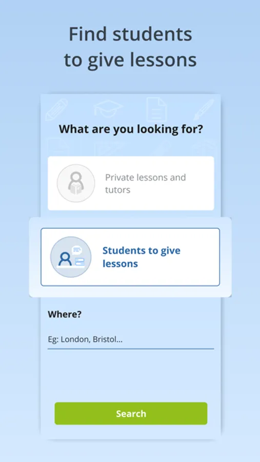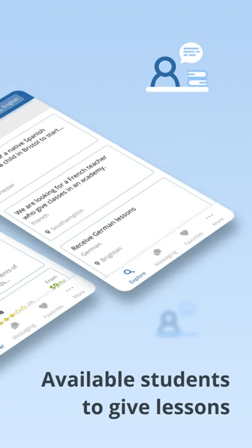 Publish your advert for free. There are no commissions. You decide how much you want to charge. Flexible hours. Students will contact you using the app’s messaging service.