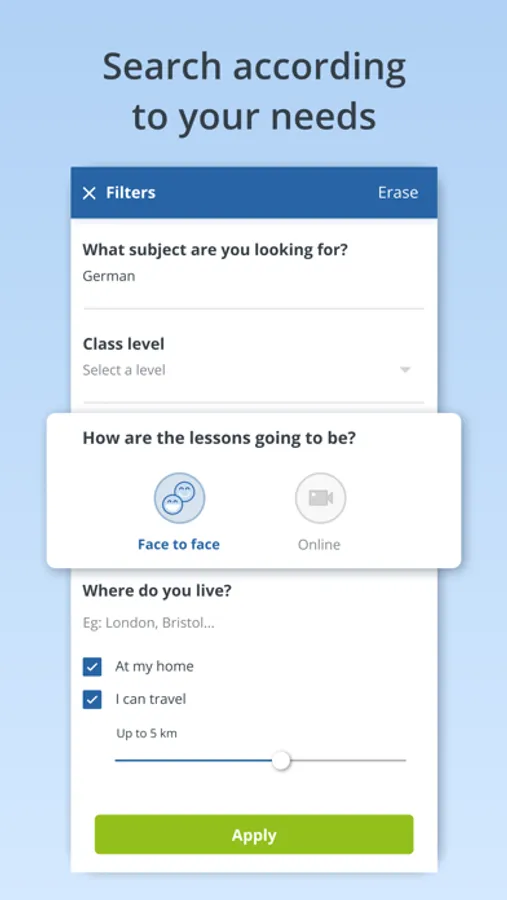 You can choose according to subject, level, location, experience and opinions. Chat beforehand via using our messaging service. Remember that there is no limit to the number of people you can contact. If you contact more than one person, you can choose the one that suits you best.
