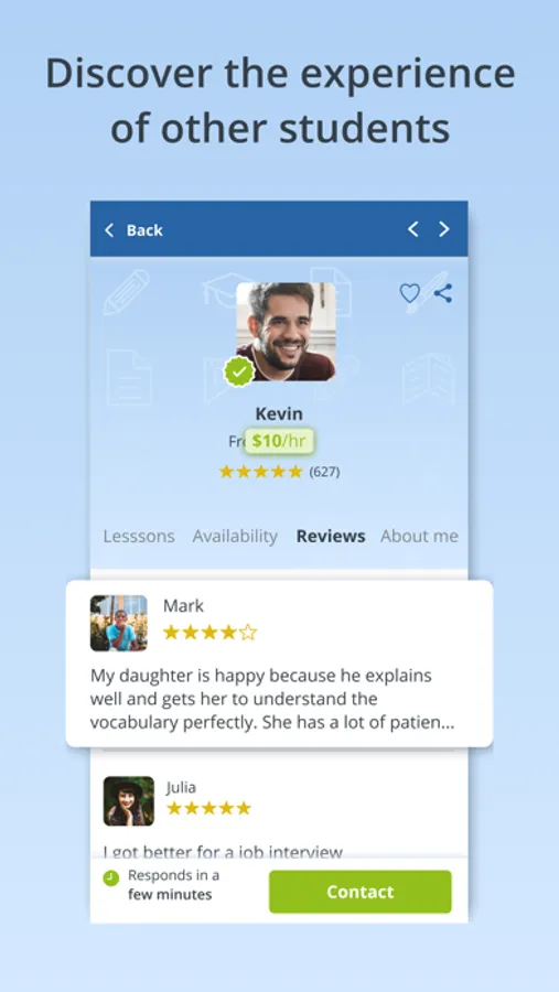 *Search for your teacher according to your needs: Choose by subject, price, timetable and location. In the FindTutors app, you will find tutors for more than 350 subjects: languages such as English, French, Russian and Japanese, school revision for children, programming, digital marketing and software such as Photoshop...