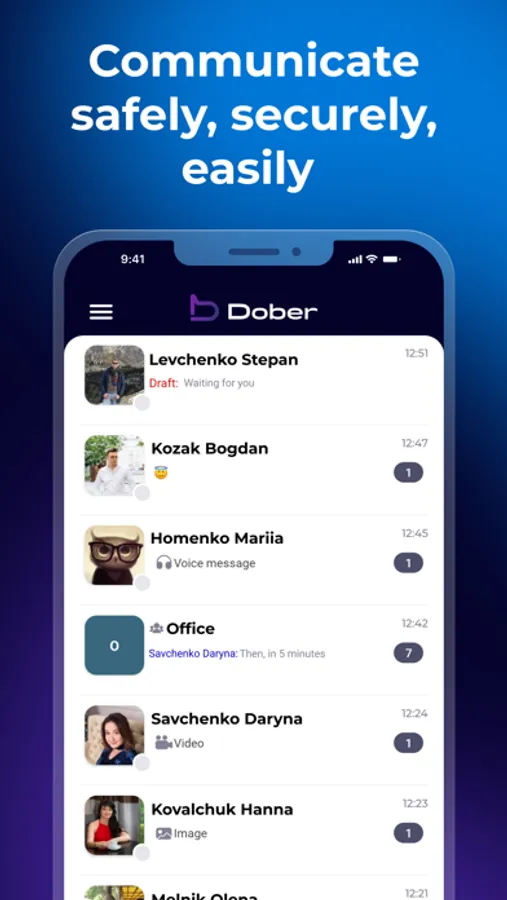 Dober Business - is highly secured corporate messenger. It allows to share instant text messages, voice messages, files, video and photo inside corporate network or through internet with dedicated server.