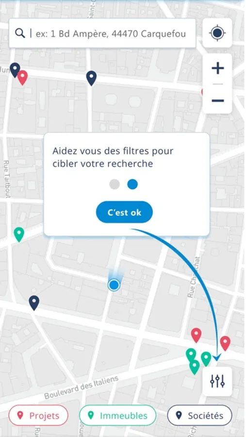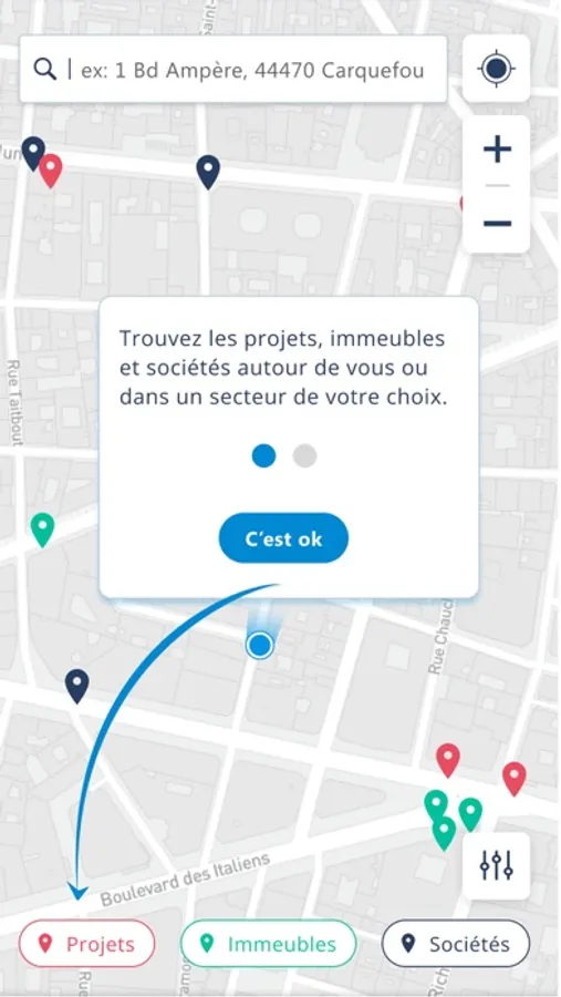 - Carte : retrouvez les informations géolocalisées dans une cartographie dynamique, les filtres vous permettent de cibler votre recherche (code NAF, effectifs, types de projet en cours ou à venir, type de bâtiment) sur le périmètre de votre choix.