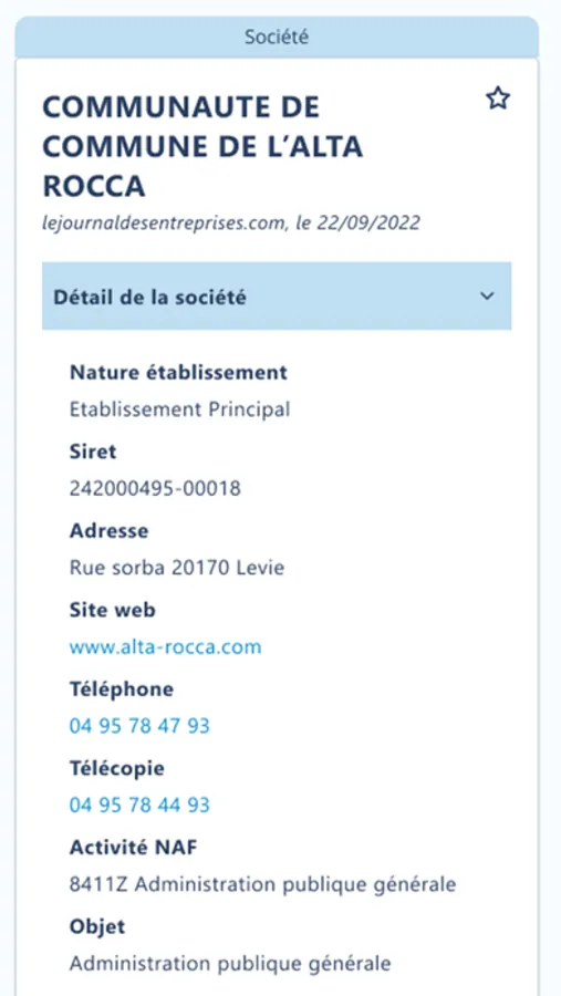 Les actualités et projets détectés sont décrits sous forme de fiches détaillées présentant toutes les informations nécessaires pour mettre en œuvre des actions de prospection. Les informations sur les sociétés et acteurs concernés (SIRENE, dirigeants, contacts, infos légales et financières, actualités et projets, appels d’offres, site web…) sont accessibles dans les Fiches Profil Société de façon simple, intuitive et dynamique.