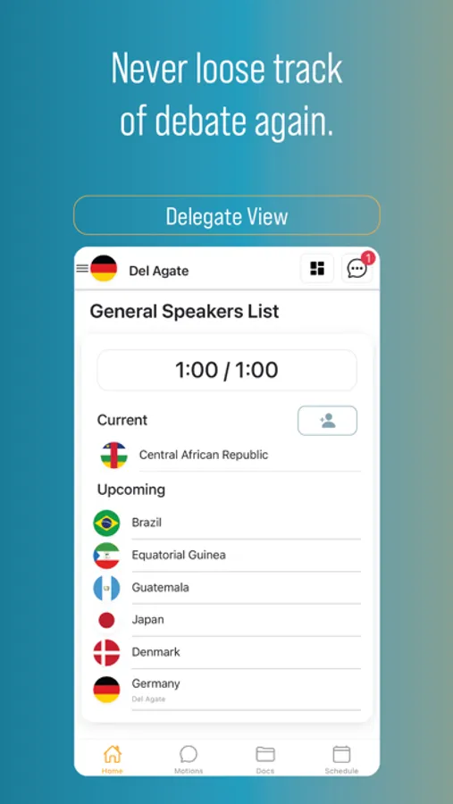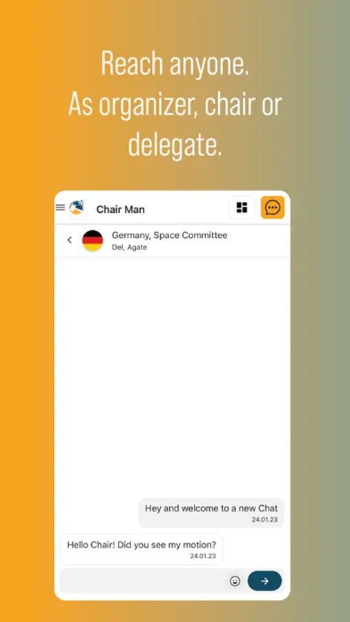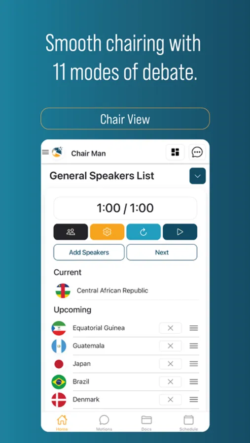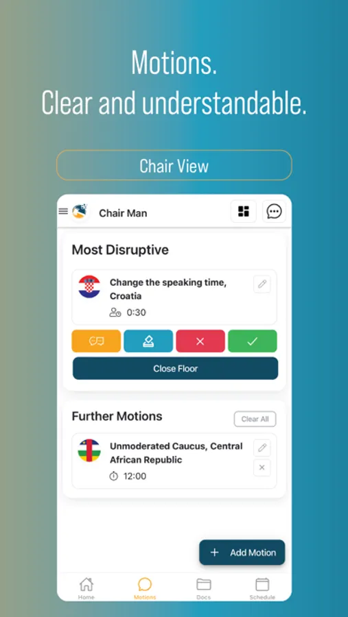 Chairs manage their committee, chat with delegates and take advantage of 21 motions and 11 different modes of debate.