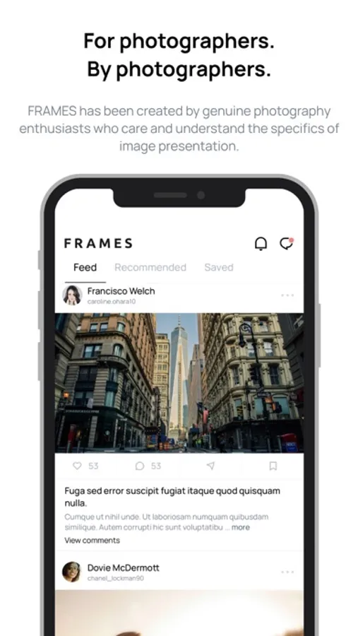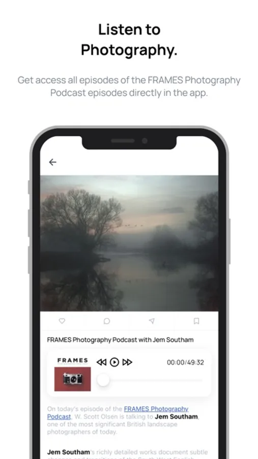Is photography important to you? With FRAMES you will not only be able to share your own work, but also connect with other like-minded photography enthusiasts and get inspired by following their projects. You will also have access to photography-related articles, videos and podcast episodes.