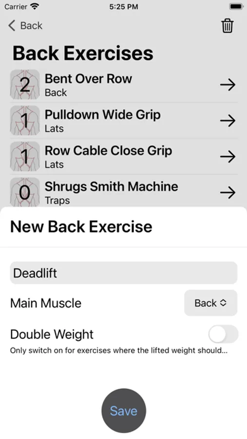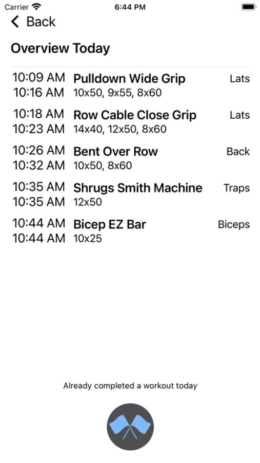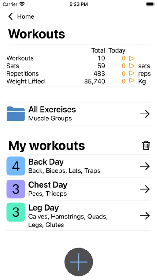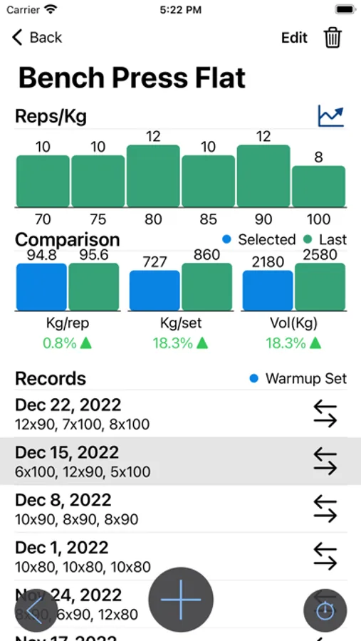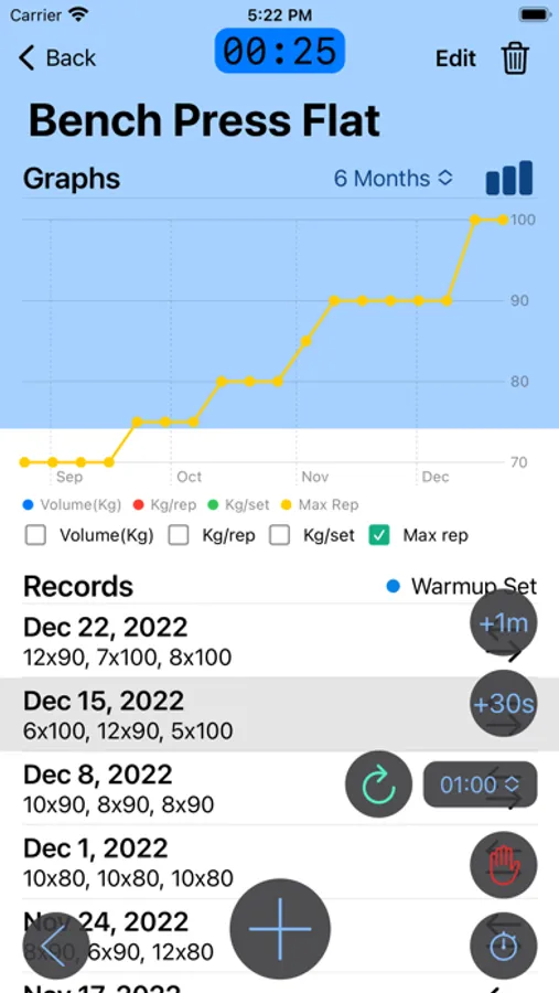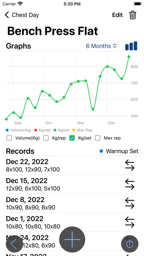 • Graphs for Volume, Kg/set, Kg/rep and Max rep