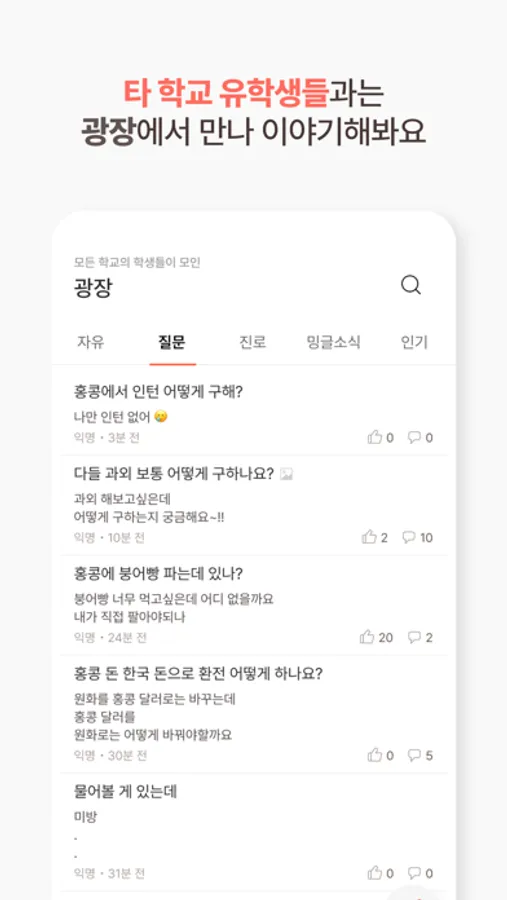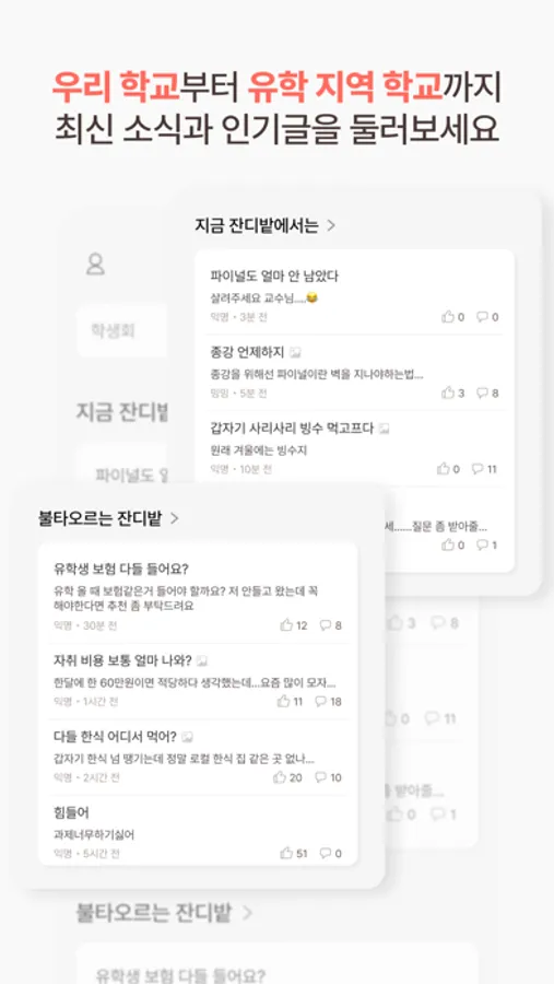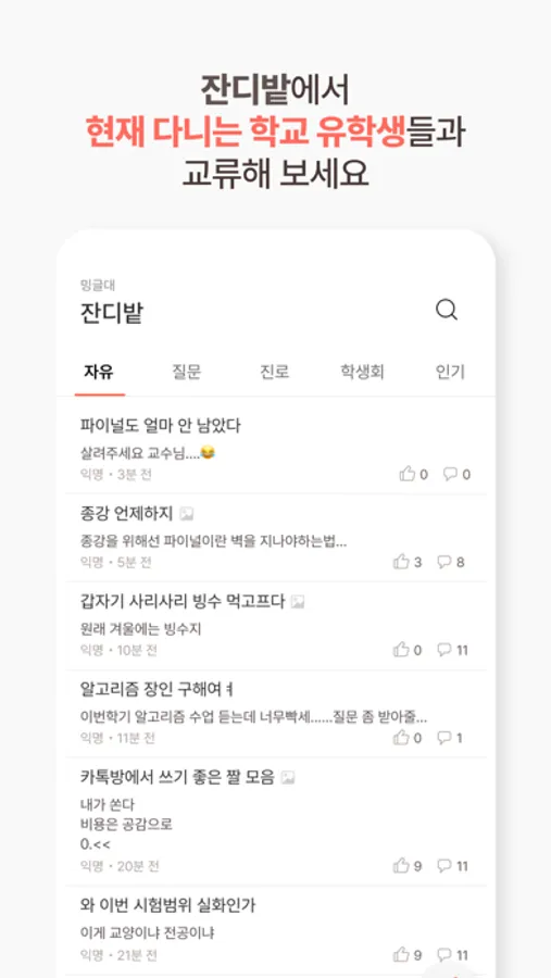 - 잔디밭: 같은 학교 학생들끼리 소통할 수 있어요.