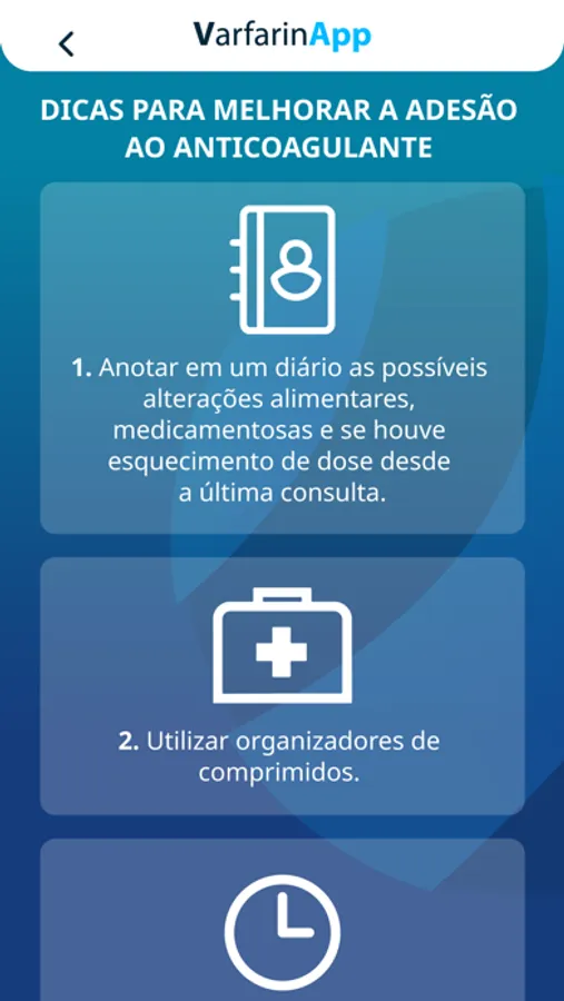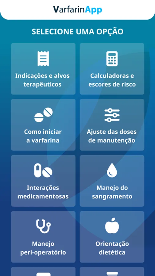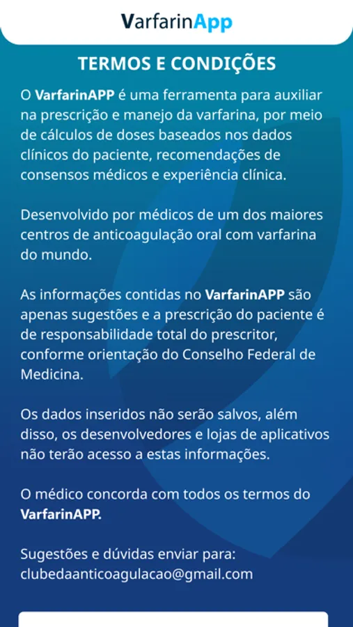 Diante desse cenário, foi desenvolvido o VarfarinApp, uma plataforma pago direcionada exclusivamente para médicos para auxiliar no manejo da varfarina. Portanto, pacientes que fazem uso desse medicamento não devem utilizar este aplicativo para realizar sua auto prescrição sem acompanhamento de um médico.