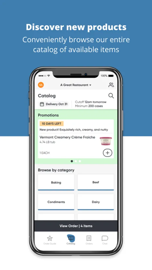 Our mobile app lets you search our complete product catalog, manage and update your ordering guide, and buy what you need at the moment you need it. It’s part of our commitment to giving you an ordering experience you’ll love.