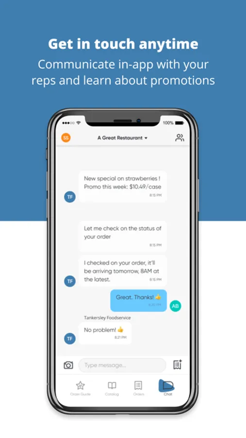 - Get in touch anytime: communicate directly with your Tankersley Foodservice rep in the app