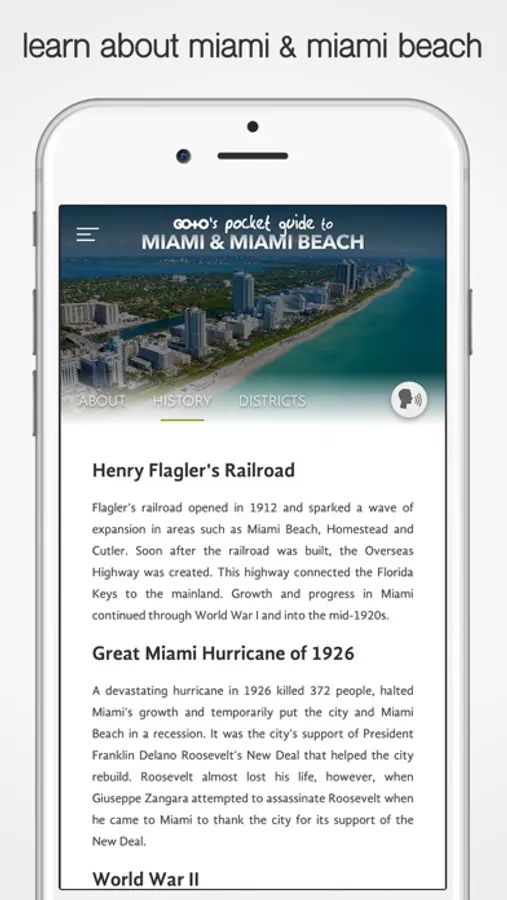 In addition to learning about the rich history of this South Florida city, book guided tours of Miami's most popular attractions, such as Biscayne Bay, Wynwood Street Art Museum, Skyviews Miami and more! Use this free travel guide app to get cheap tickets and skip the lines at the tourist attractions. With our easy-to-use city guide & trip planner, your smartphone becomes your personal tour guide through the streets of Miami and Miami Beach.