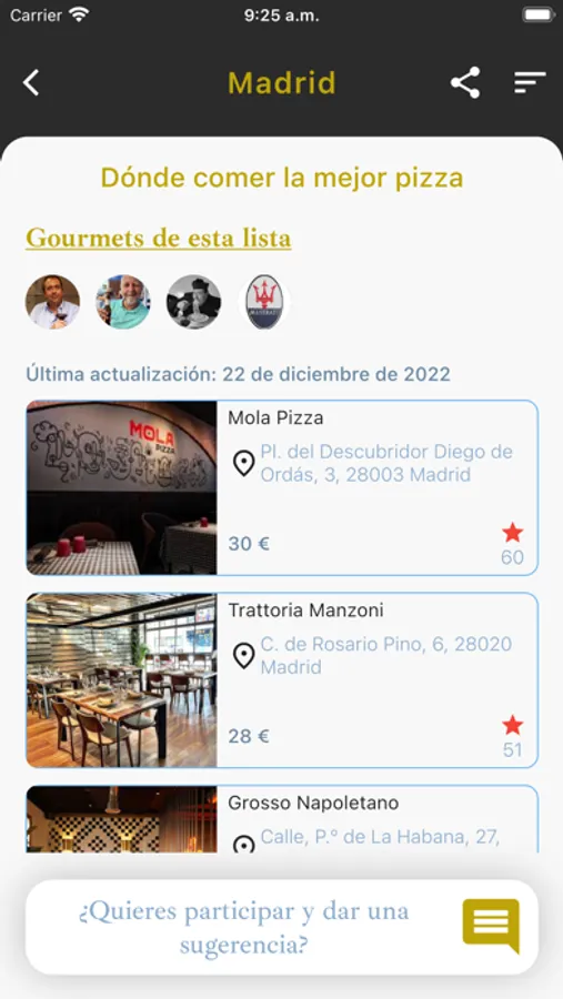 - Dar feedback al creador de una lista e incorporar en una lista ya hecha nuevos restaurantes