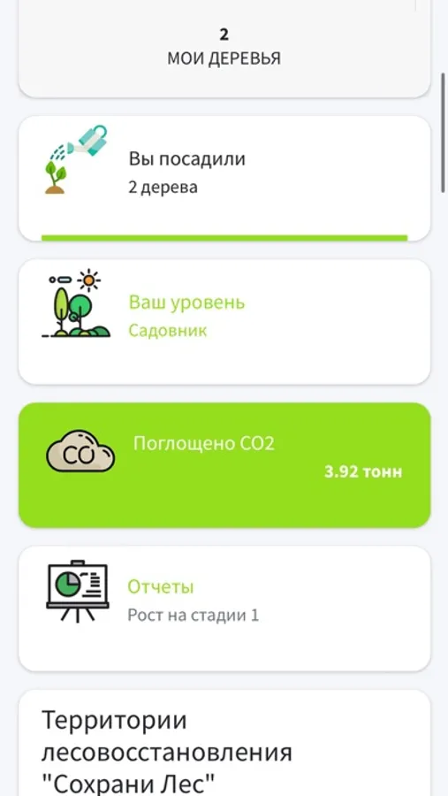 “Сохрани лес” — экологический сервис для посадки лесов и компенсации углеродного следа человека. С помощью нашего приложения вы сможете посадить деревья в любом уголке России, наблюдать за их приживаемостью и ростом, а также увидеть количество CO2 поглощенного Вашим лесом..