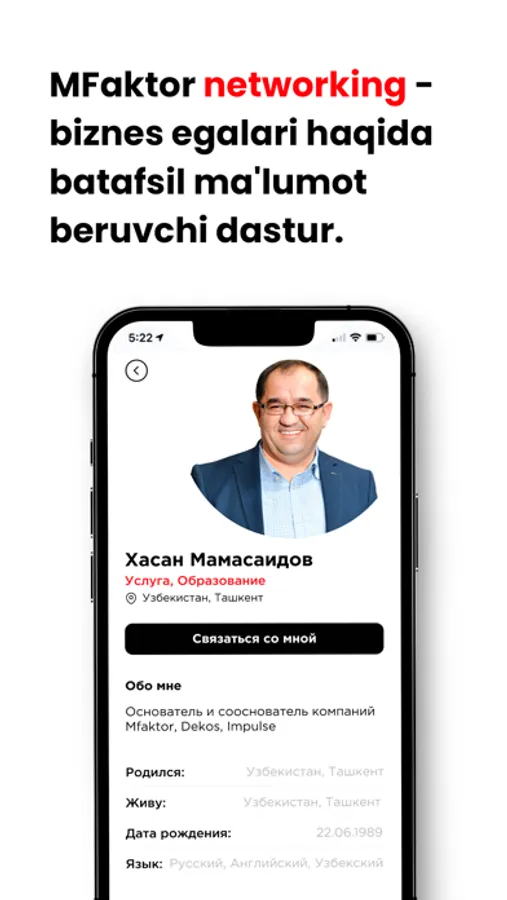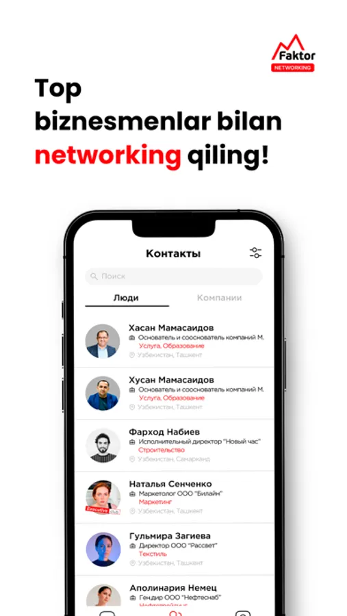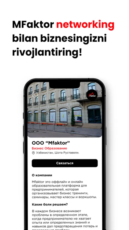 Mfaktor Networking - Приложение для создания и расширения бизнес отношений и нетворкинга среди предпринимателей, слушателей и гостей проекта Мфактор Узбекистан. С помощью приложения люди могут знакомиться, обмениваться контактами, делиться информацией о своей компании или услуги, а также можно будет находить партнёров и клиентов для вашей компании или услуги.