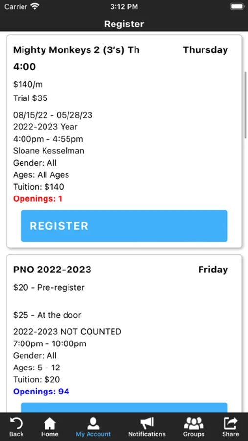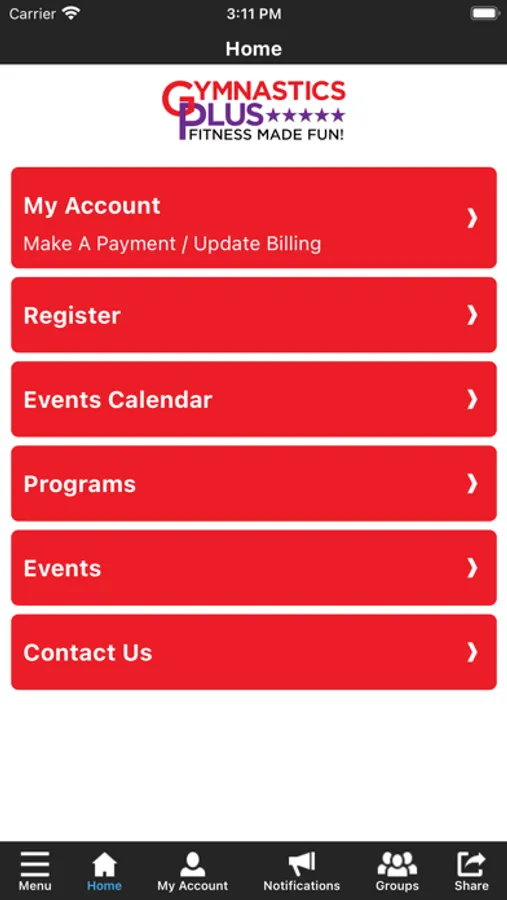 The Gymnastics Plus app allows you to manage your account with ease, register for classes, parties, and special events. You'll also receive important notifications about class changes, closings, registration openings, special announcements, and upcoming events.