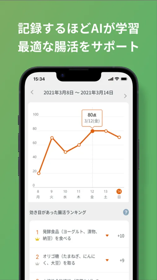 カレンダーを見ながら腸の状態を振り返りましょう。記録を続けることで、あなたにとってどんな腸活が続けられたのか、効果的だったかをレポート機能でフィードバックします。