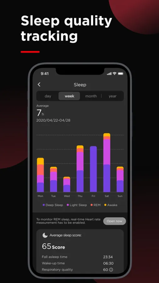 Record your sleep data, including sleep duration, deep sleep, light sleep and rapid eye movements (REM), in order to monitor and improve your sleep quality;