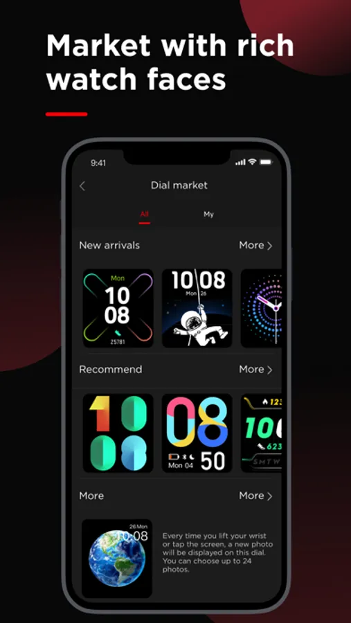 [Change Dial]: A rich selection of watch face themes are available in the brand-new cloud dial market, giving your device a new look every day;