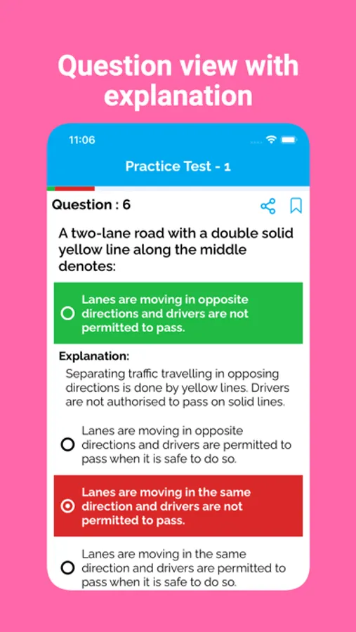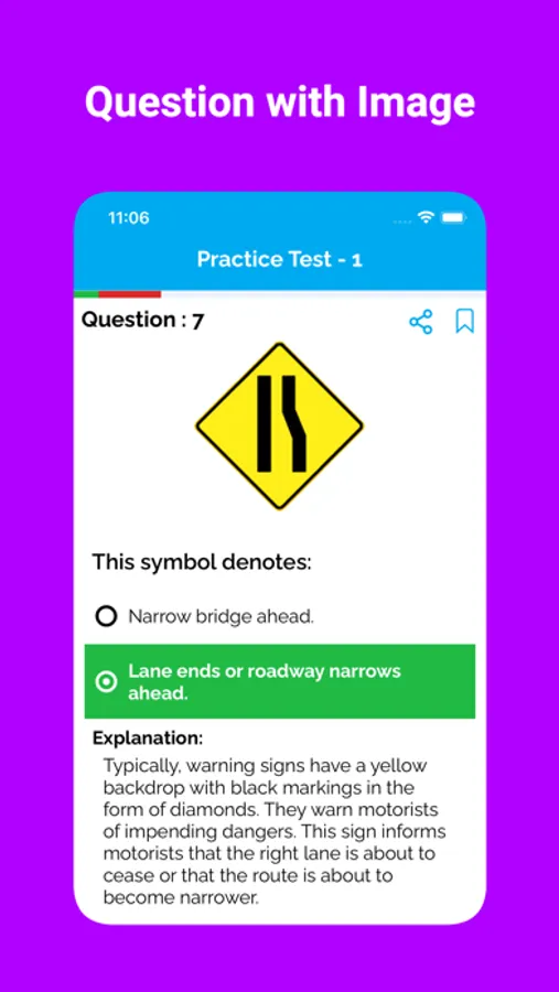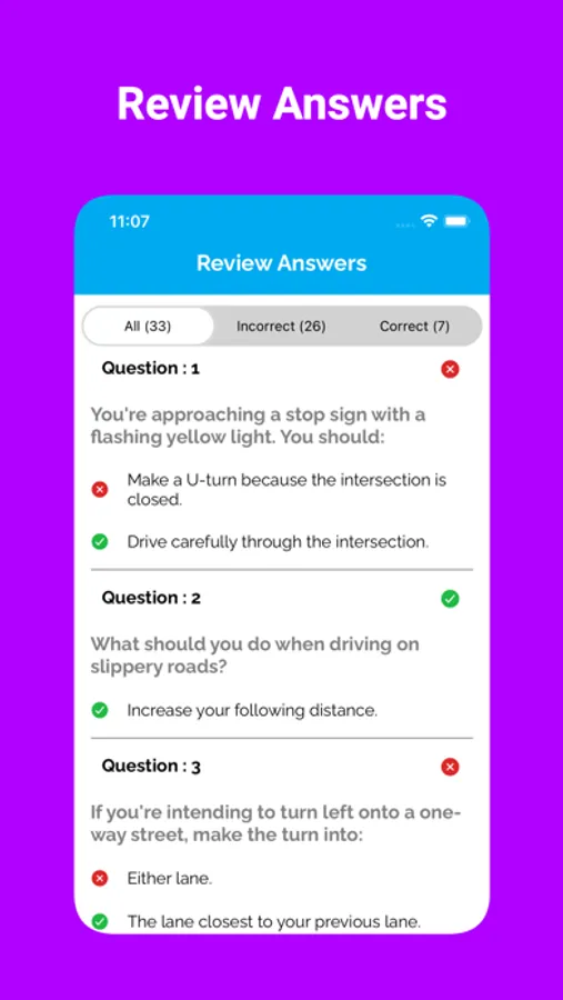 Our app includes a variety of practice questions for the Driver's license exam for Car, Motorcycle and Commercial Vehicles. These questions are based on the official handbook of different states.
