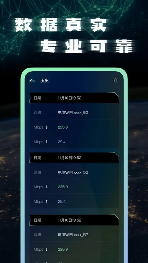 2. 测速历史及详情,快速查阅历史测速情况,一目了然,轻松查阅测速报告;