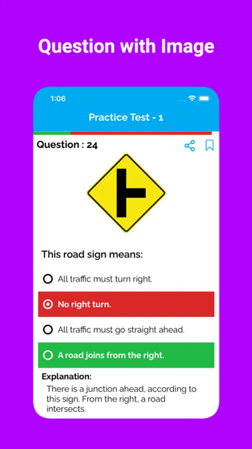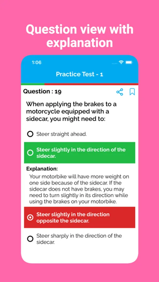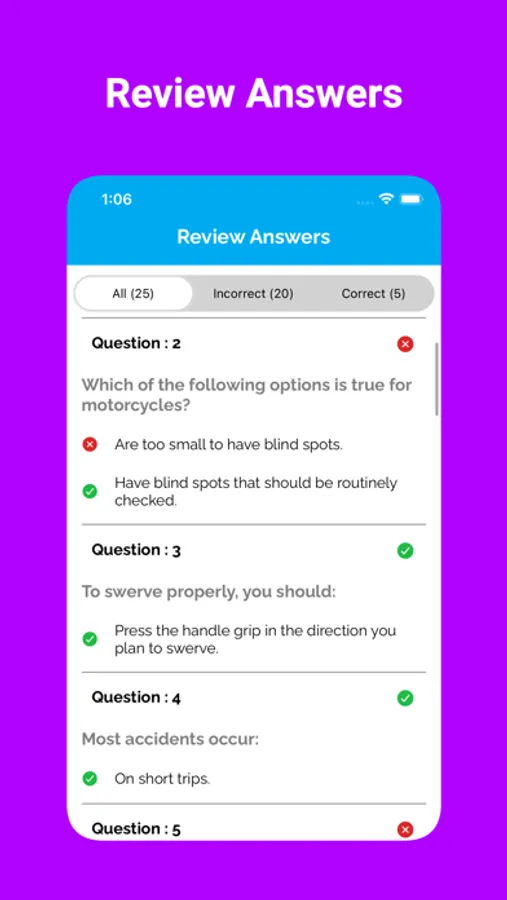 Our app includes a variety of practice questions for the Driver's license exam for Car, Motorcycle and Commercial Vehicles. These questions are based on the official handbook of different states.