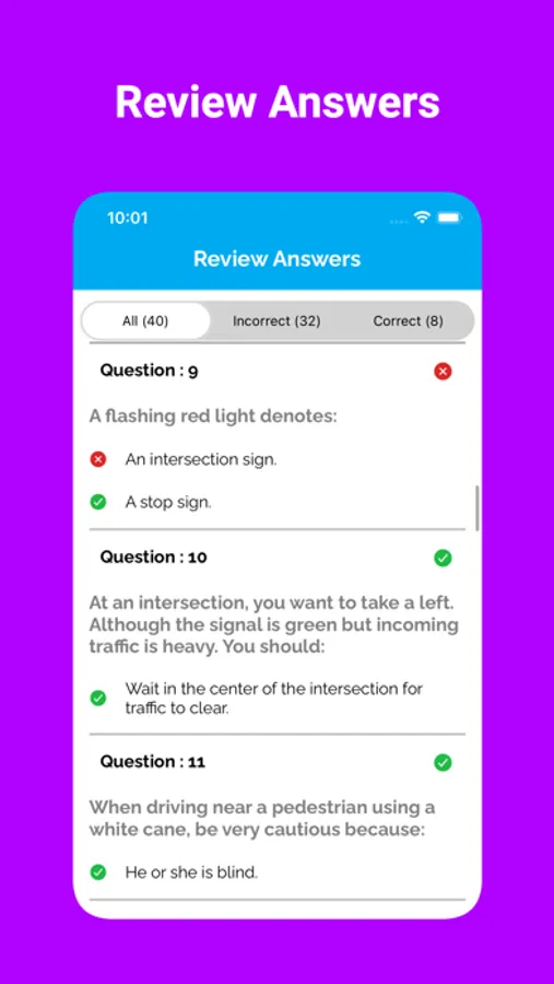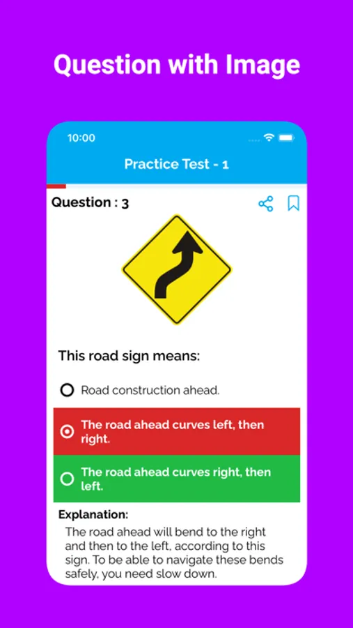 Our app includes a variety of practice questions for the Driver's license exam for Car, Motorcycle and Commercial Vehicles. These questions are based on the official handbook of different states.