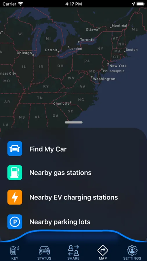 With a live map, you can find the location of your car, nearby gas stations, EV charging stations, parking lots, etc.