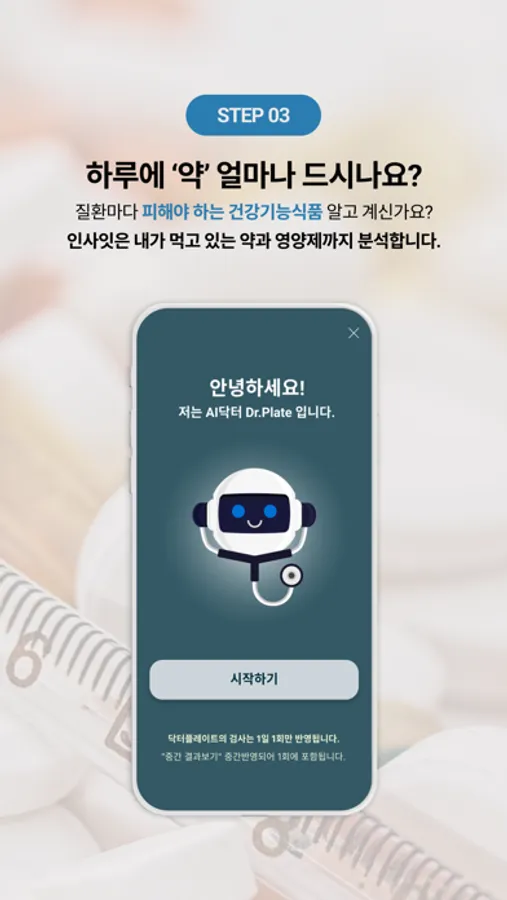 당사는 의료 면허를 갖춘 의료 제공자가 아니며, 본 앱이 추구하는 목적은 질병이나 의료 증상에 대한 전문적인 의학적 조언이나 진단, 치료 또는 관리를 대신하고자 하는 데 있지 않으며, 식재료 추천을 통해 건강 관리에 도움을 주고자 하는 것입니다. 귀하의 건강에 대하여 조치를 취하기 전에, 면허가 있는 의사나 기타 자격을 갖춘 의료 제공자와 상담하시기 바랍니다. 본 앱과 관련하여 어떤 내용을 읽었다는 이유로 전문적인 의학적 조언을 무시하지 않아야 하며, 전문적인 의학적 조언을 구하는 일을 지체하지 않아야 합니다. 건강 및 증상과 관련하여 궁금한 점 또는 염려되는 점이 있거나 증상이나 건강 상태에 어떠한 변화가 있는 경우, 반드시 의료 전문가와 상담하십시오.